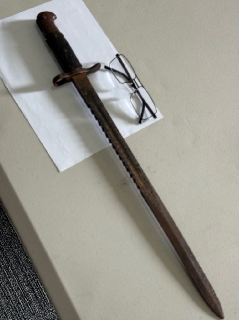 The AI immediately responded, emphatically stating that it was not of German origin, but British. A pattern commonly used in the Australian army. Made from 1909 – 1918. During WW1 the Germans had complained that it was a cruel and inhumane weapon because of the aggressive serrations.
