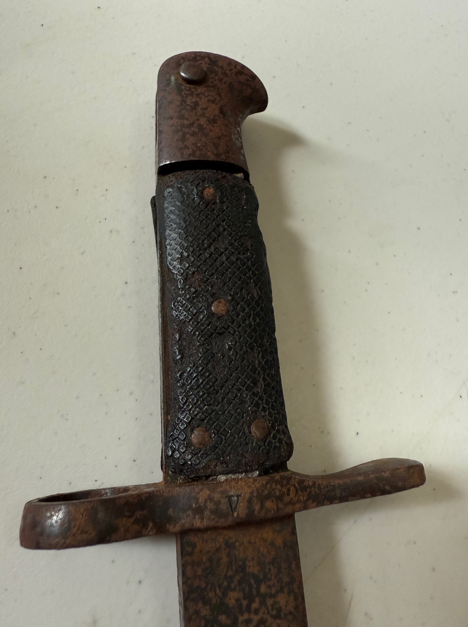 Not a good photo unfortunately, but it does show that it is a long heavy bayonet, with marked serrations.The rust is mostly superficial, but it is swelling underneath the grips, causing the grips to be pushed outwards.