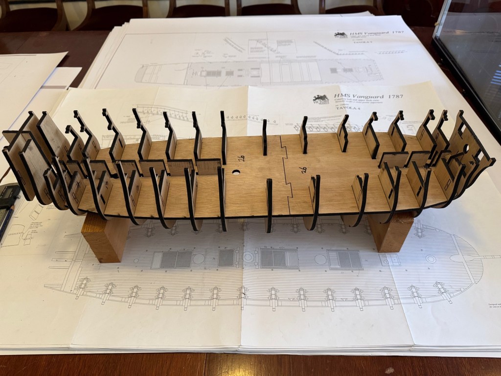 The deck (?orlop deck) holds the bulkheads in good position. Gluing yet to occur. I am pretty happy with how it all fits together, despite my alterations to cope with the increased ply thickness from 5 to 6mm. At this stage it could still be Vanguard, but it will not remain so.