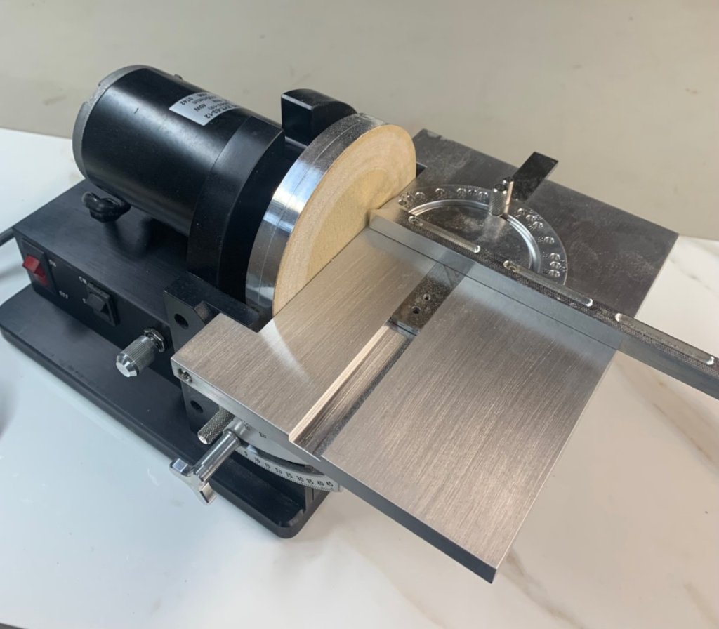 My version has a variable speed (0-4500 rpm) and reversible 1 hp servo motor, a tilting table graduated in 5 degree pinned steps, plus 0-45 degrees variable, and generally very compact and easily set up. I will get around to an angled fence in a slot similar to the Byrne model in photo 1. I will also make provision for attaching a vacuum hose. The sandpaper disk is self adhesive and easily and quickly changed.