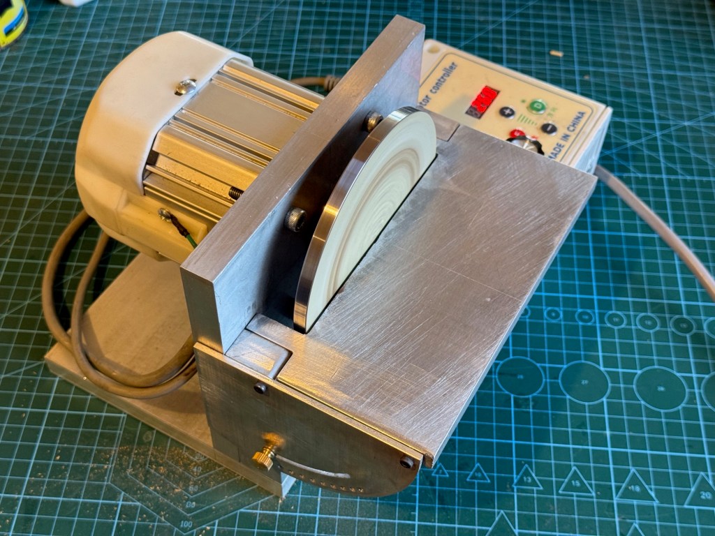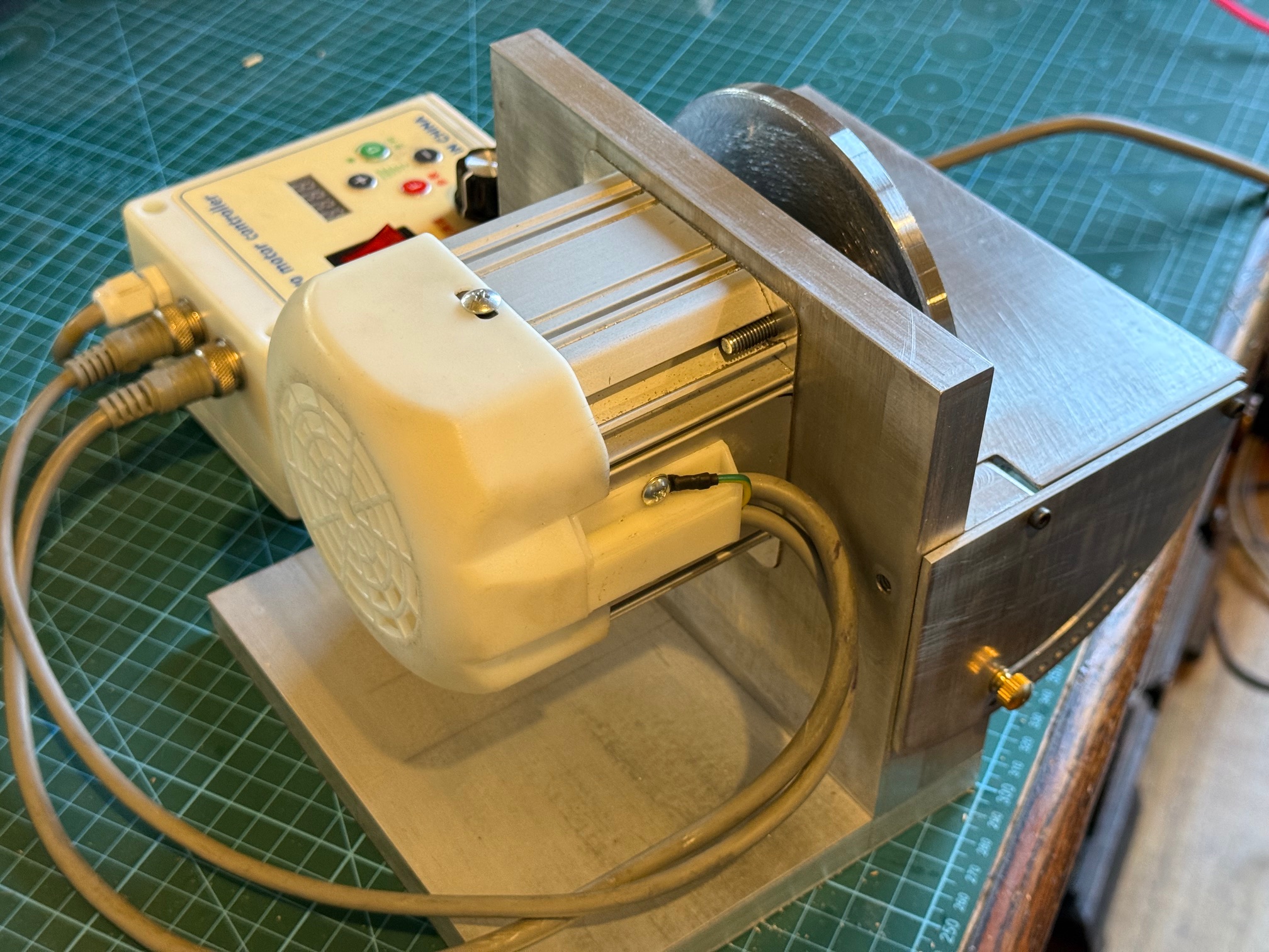 The aluminium structural parts are 16mm thick, and held together with 6mm cap screws, so it seems quite solid. Again, the alu is all from my workshop left overs. So it has been a relatively inexpensive build. Only outlays were the motor ($aud150 approx), and 50 sheets of self adhesive aluminium oxide disks ($aud50), all from China.