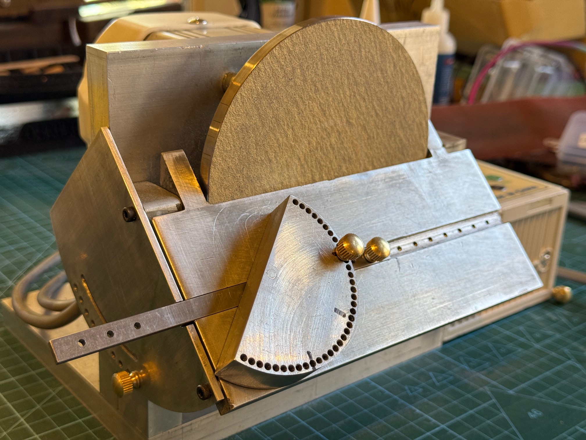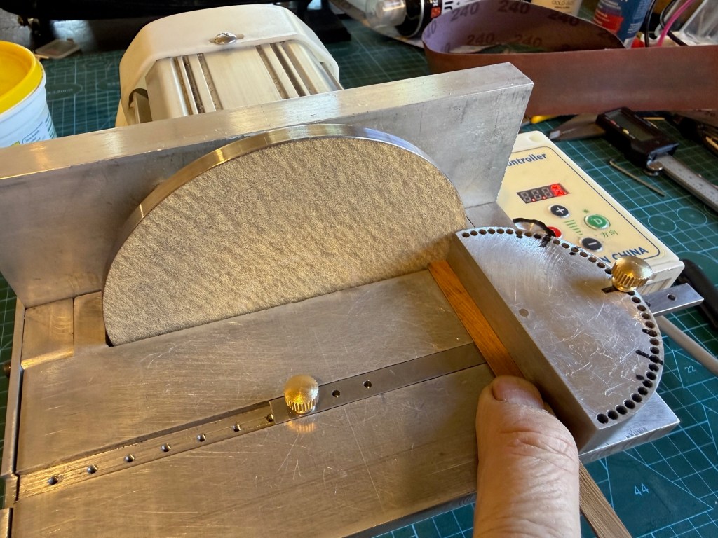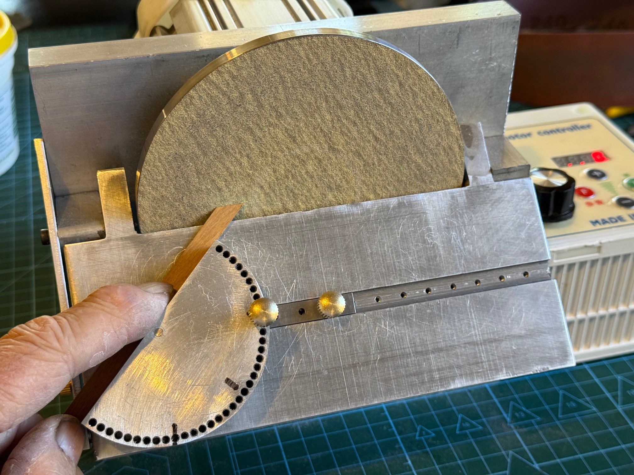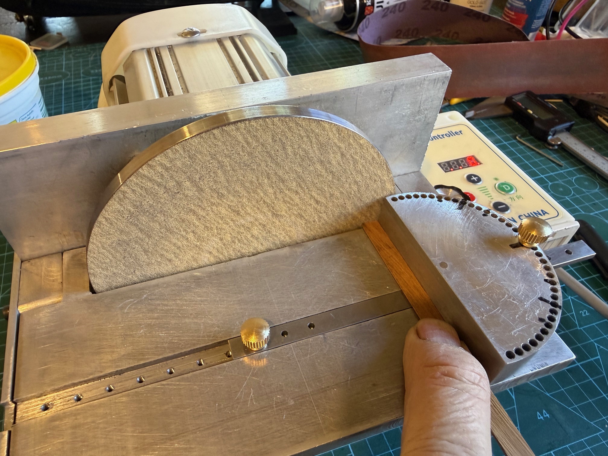 The table now has a central slot, and a series of M2.5mm threaded holes at 10mm spacing. The protractor fence slide also has some 2.5mm holes, allowing the slide to be fixed anywhere along the slot. The motor is reversable, so either end of the table can be used. The protractor fence has holes at 5 degree intervals, and some felt pen marks at 30,45,60 and 90 degrees. I will ask Stuart T to laser some more permanent markings. The brass knob fits neatly into the holes. In this position the sander machines a neat square end in the wood.