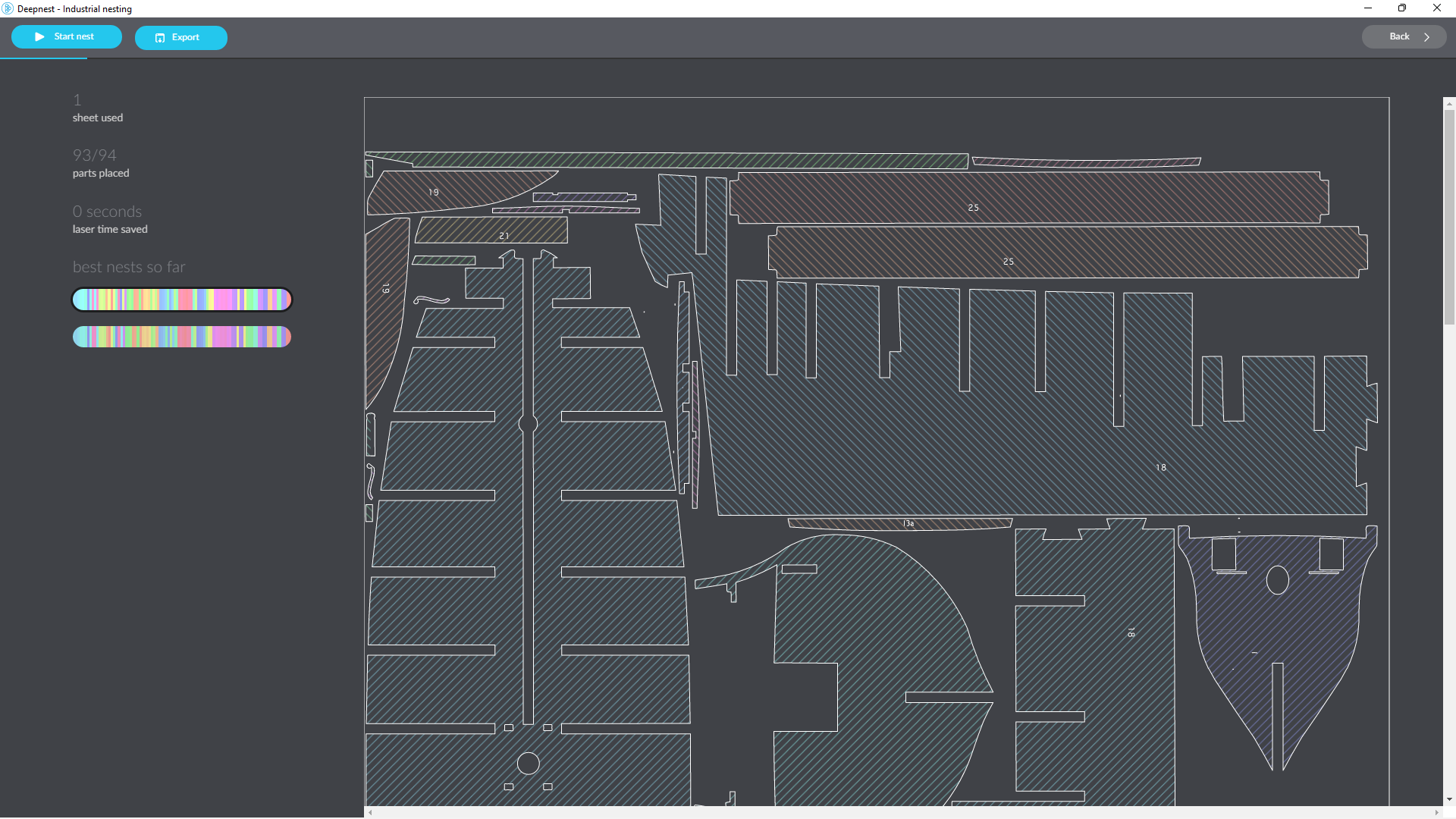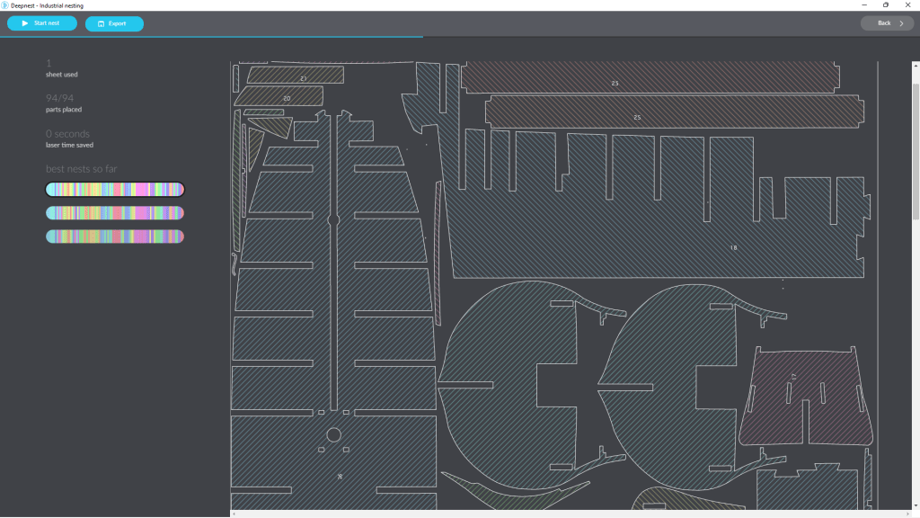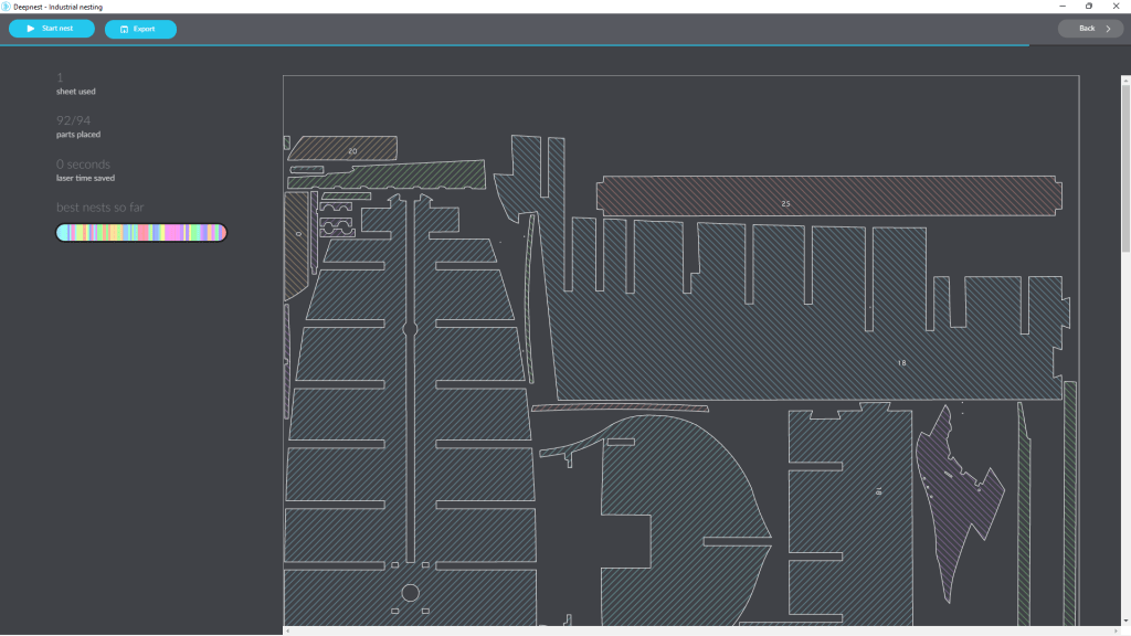 I imported the dxf containing all 94 parts I wanted cut from the sheet and ran the program. Importing the parts took a couple of minutes. The program took another couple of minutes to sort 92 of the 94 parts into my 600 x 1200mm sheet. I can show only screen shots, so only the top half of the sorted arrangement is in the photo. Top left indicates 92/94 and the coloured bar represents the parts.