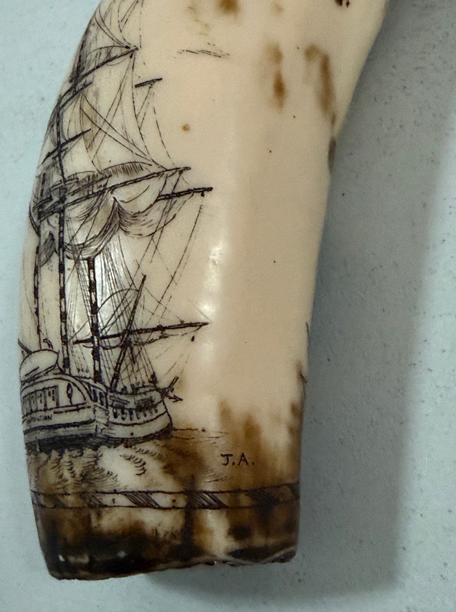 The ChatGPT report was that it IS genuine scrimshaw carved into marine bone or tooth, and probably late 19th or early 20th century scrimshaw. The fine detail, name on the ship, and carver’s initials indicate that it was made on shore rather than on a whaler or sailing ship. And it suggested a value of $800-$2500 !!