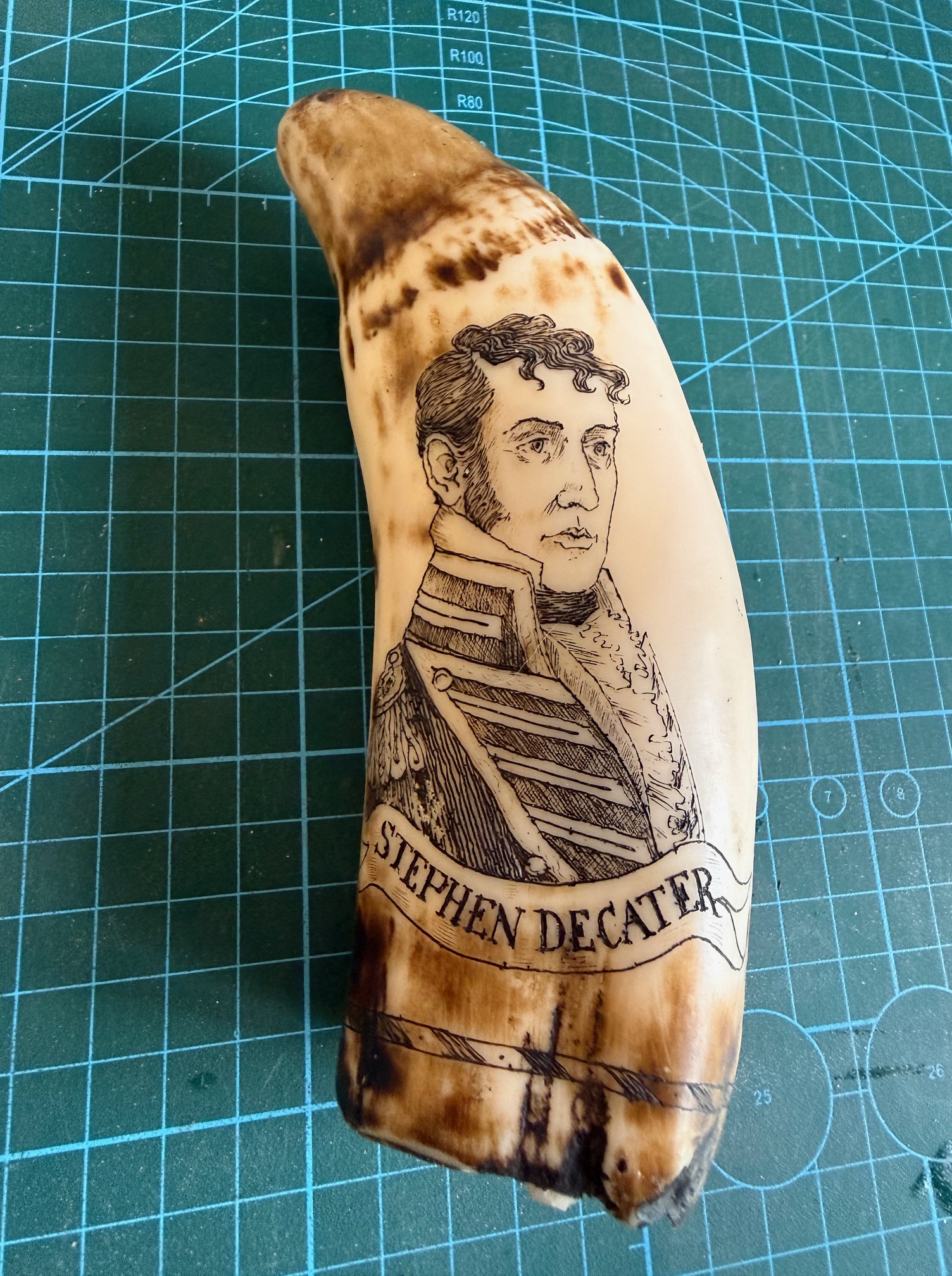 Another member took some photos and asked for an opinion from his AI. It reported that it was a cheap epoxy tourist trinket, not bone or marine tooth. But even so, I was thrilled to inspect the detailed Constitution rigging, and the very clear portrait of Stephen Decatur.