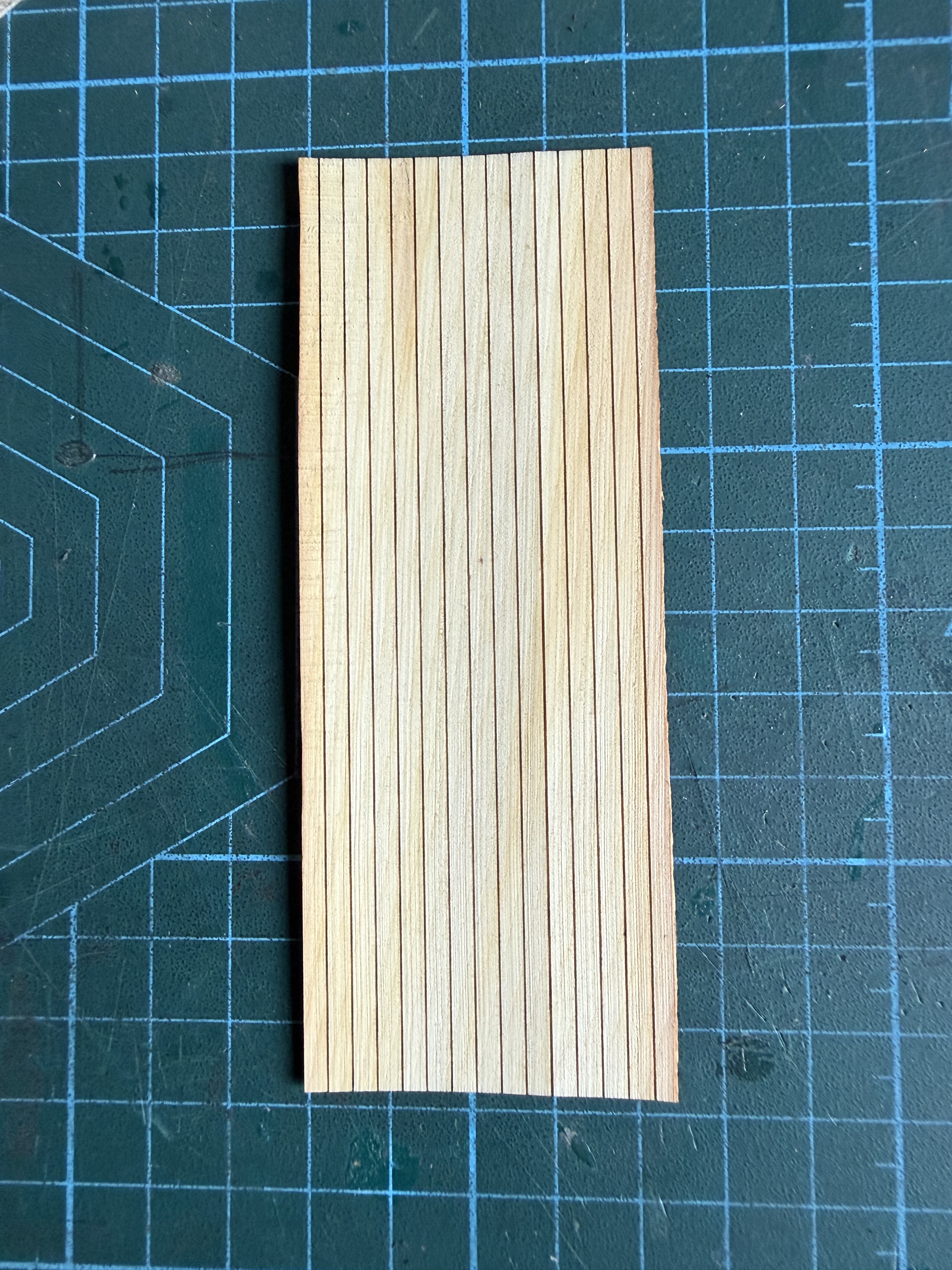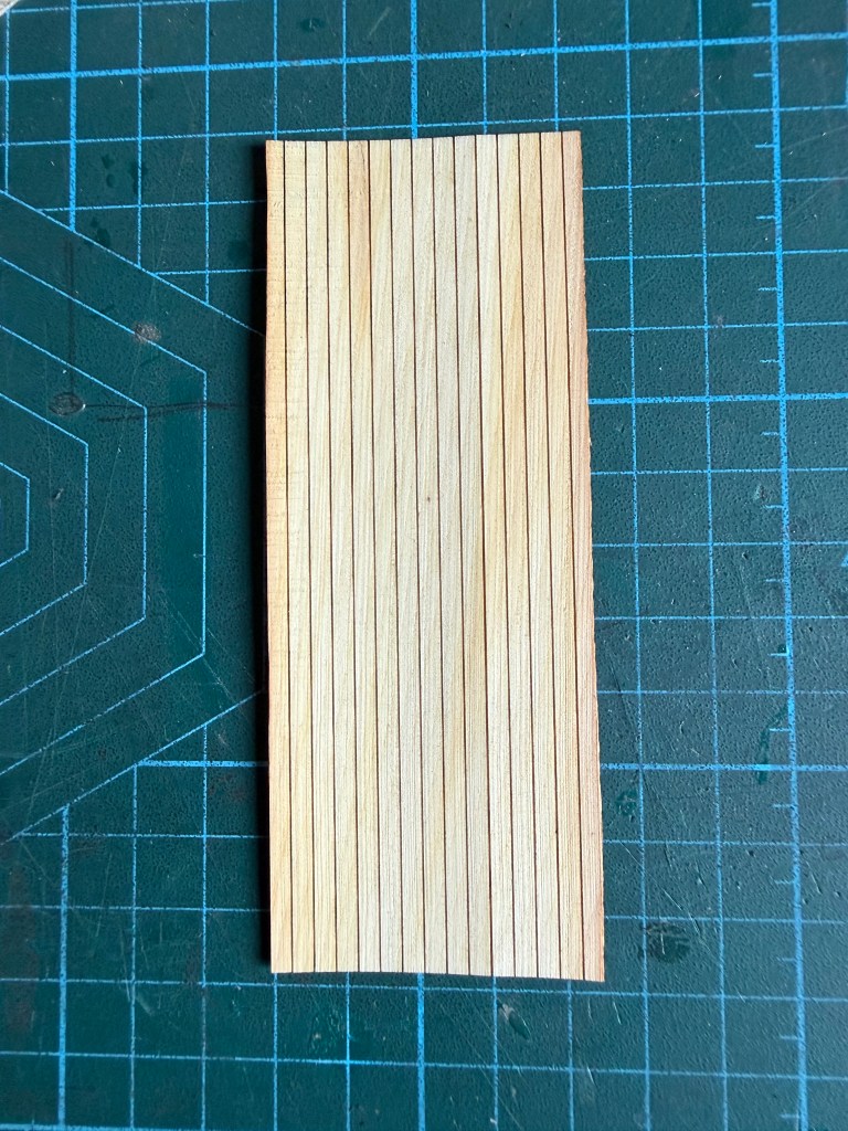 These are 3mm wide ships planks, cut about half way through 0.6mm Huon pine. The 120mm x 45mmslab of planks was then fully cut. In future I will add marks to resemble the top of trenails, and to mark staggered ends of planks. But one thing at a time!