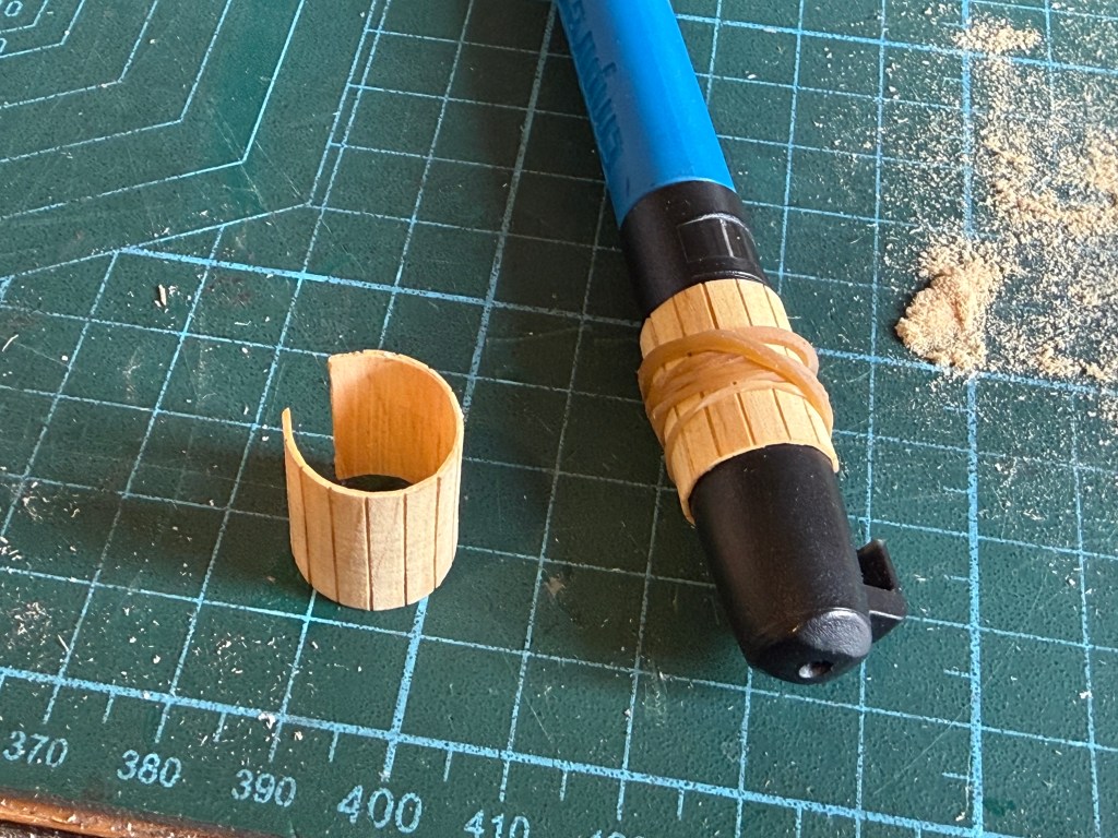 So I cut off a piece of the planks, soaked it in warm water for a few minutes, then bent it around an appropriately sized cylinder and let it dry overnight. It retained its cylindrical shape. I had tried to bend it without soaking, but it just snapped along the cuts. Later I made 2 more of these, cut to the correct length, and used them as pictured in the photo before this one.
