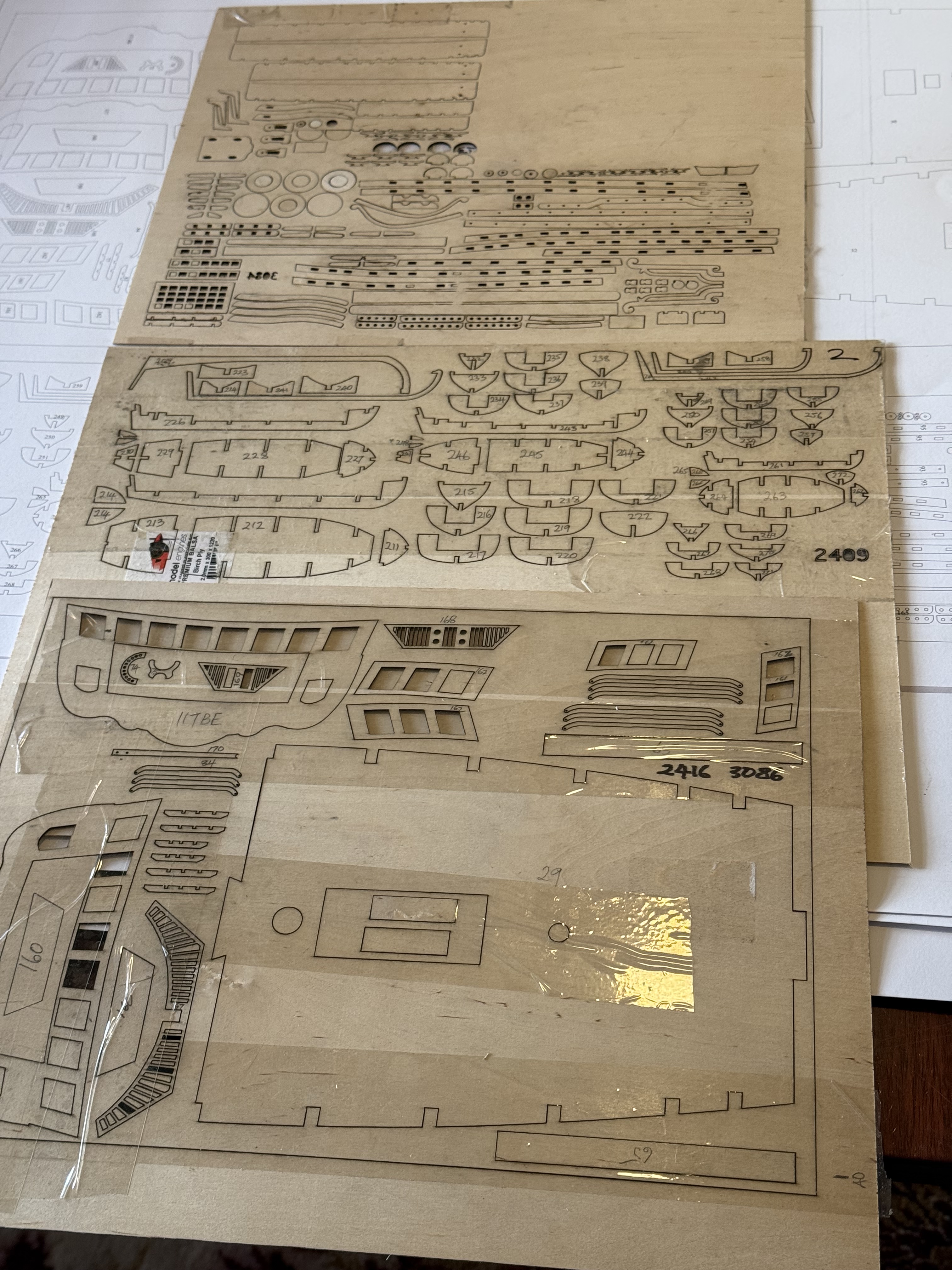 Some of the parts made so far. The sticky tape is to stop the parts falling out of the parent sheet during storage. At that stage I had not learned how to add tabs.