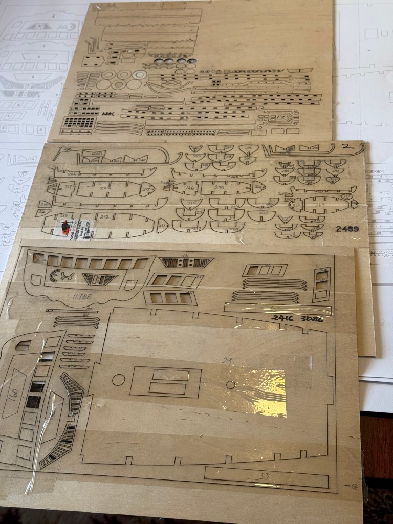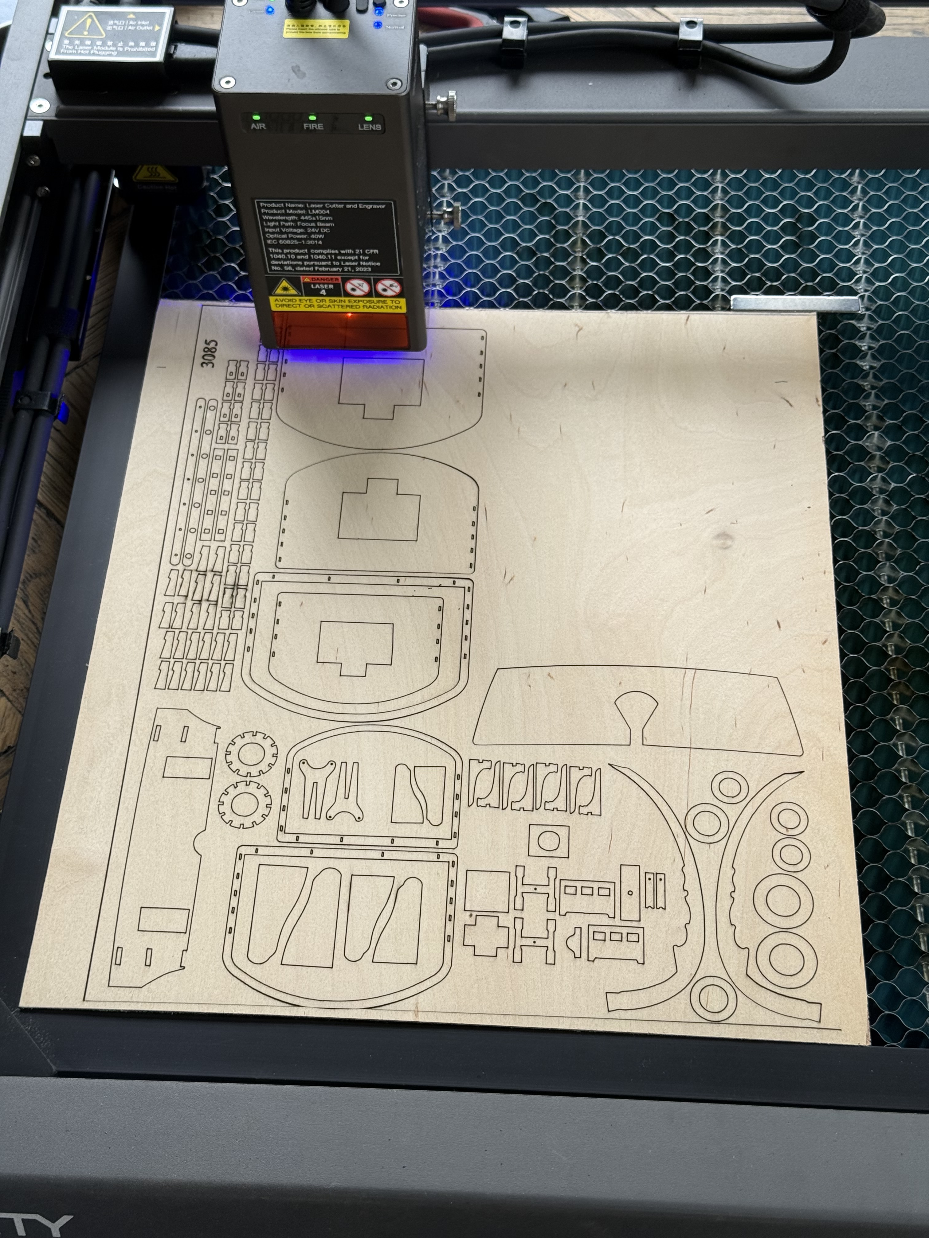 This lot, in 1.5mm plywood, took about 15″ to cut after several hours of computer preparation of the drawing files. By this stage I had learned about tabs, and sticky tape not required.