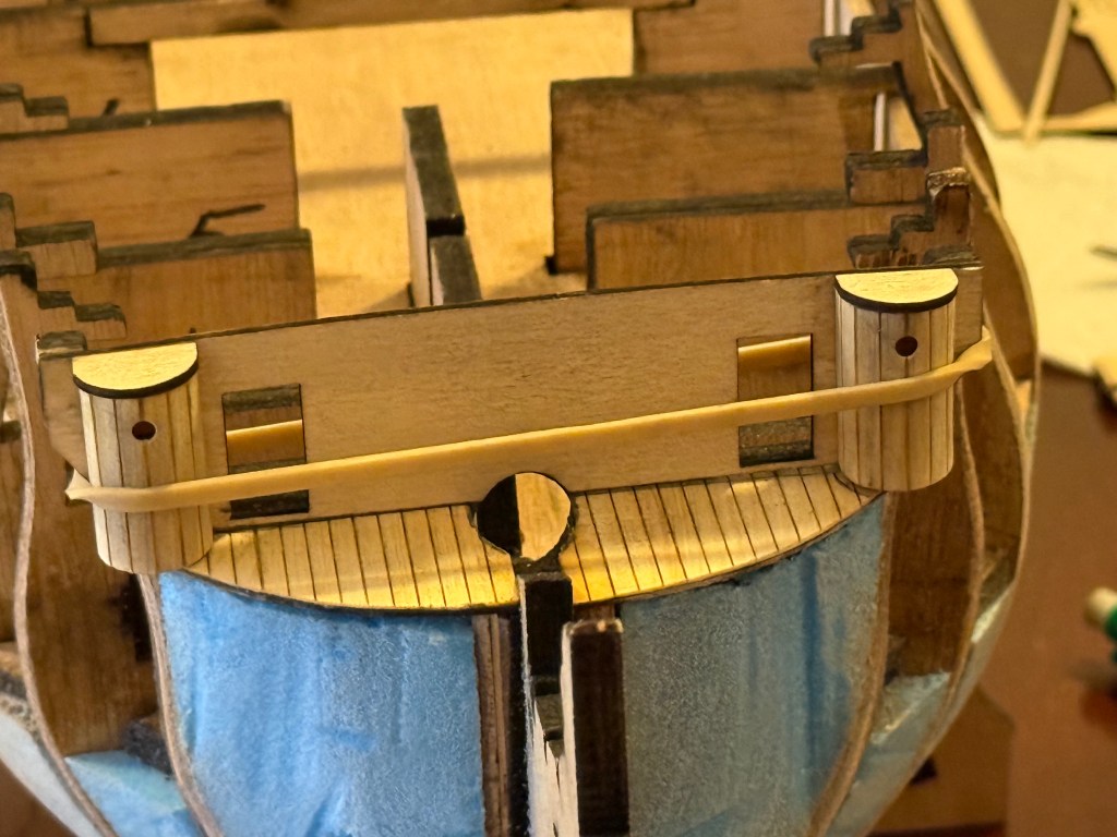 The little semi cylindrical structures sitting on the prow of the Bellerophon are actually dunnies for the crew. They overhang the sides presumably so the products drop straight into the ocean. The plans call for the planks to be glued individually, but I thought that I would try a quicker neater method using the slab of planks pictured above.