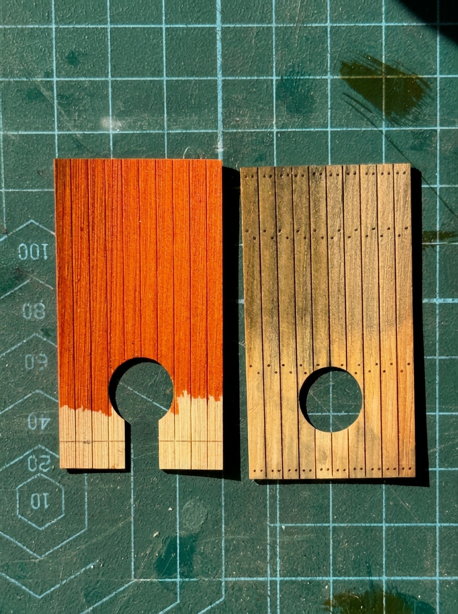 So I looked at many pictures of models of warships 1750 – 1820 on “Ships of Scale”, read all of my modelling books (not much help there), and thought about how oak and pine would have reacted to years of use on a 74 gun ship.