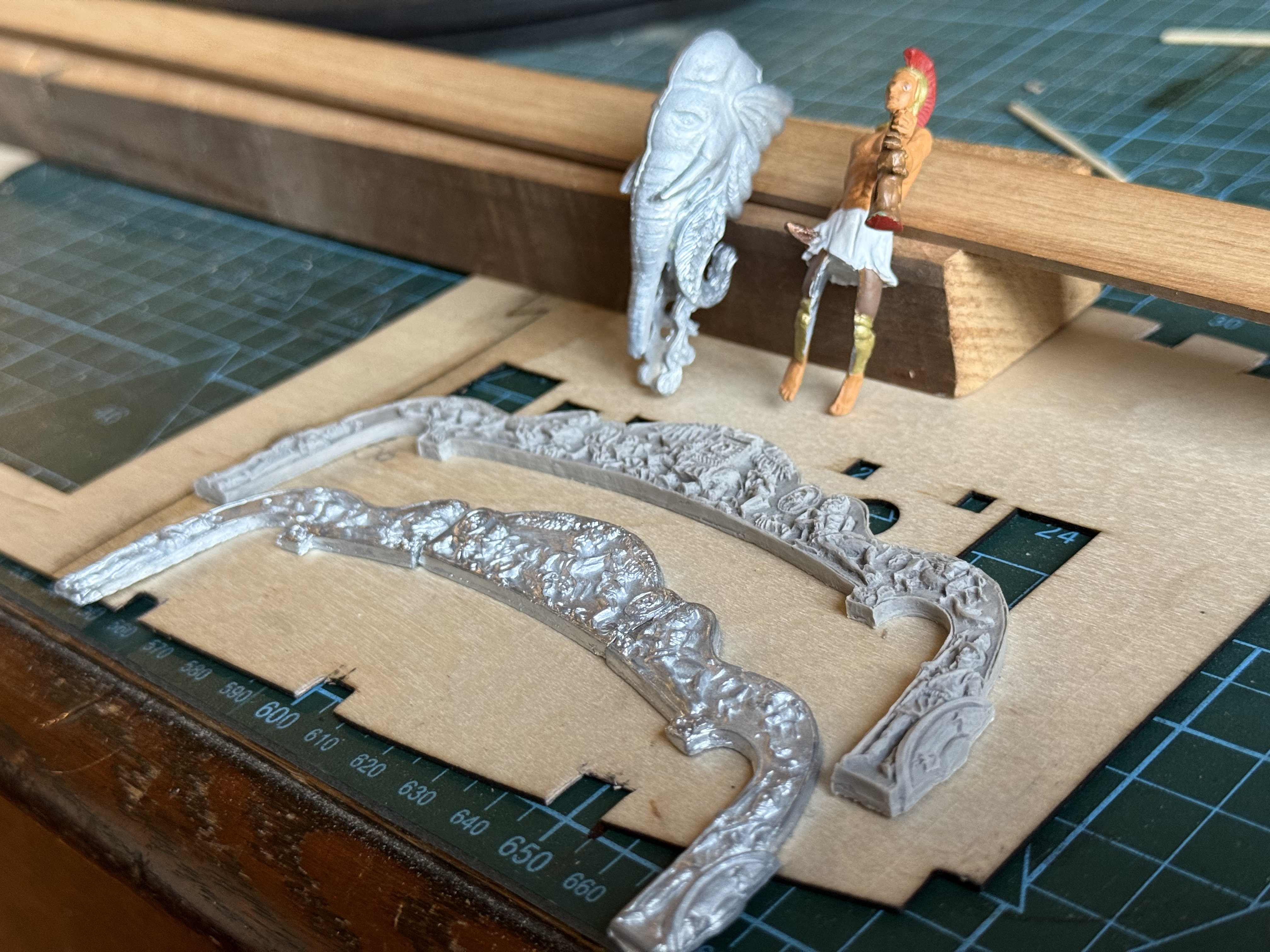 My friend had even painted the figurehead of Bellerophon, as practice before painting his Vanguard figurehead. The Bellerophon stern decoration is cast metal, and the Elephant stern is 3D resin printed. The detail in both is very fine, perhaps a little better defined for Elephant. The originals would have been carved in wood.