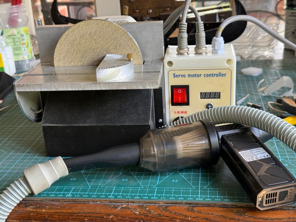 p.s. A few days later I printed a lid for the dust box/vacuum attachment, to increase the air flow around the sanding disk. And used an old CPAP machine hose to connect to the box and the vacuum machine. The vacuum is one of those cheap Chinese rechargeable battery tools that is always on hand to my modelling desk. The lowest setting is the quietest and seems adequate. Cost in Oz about $aud20-30.