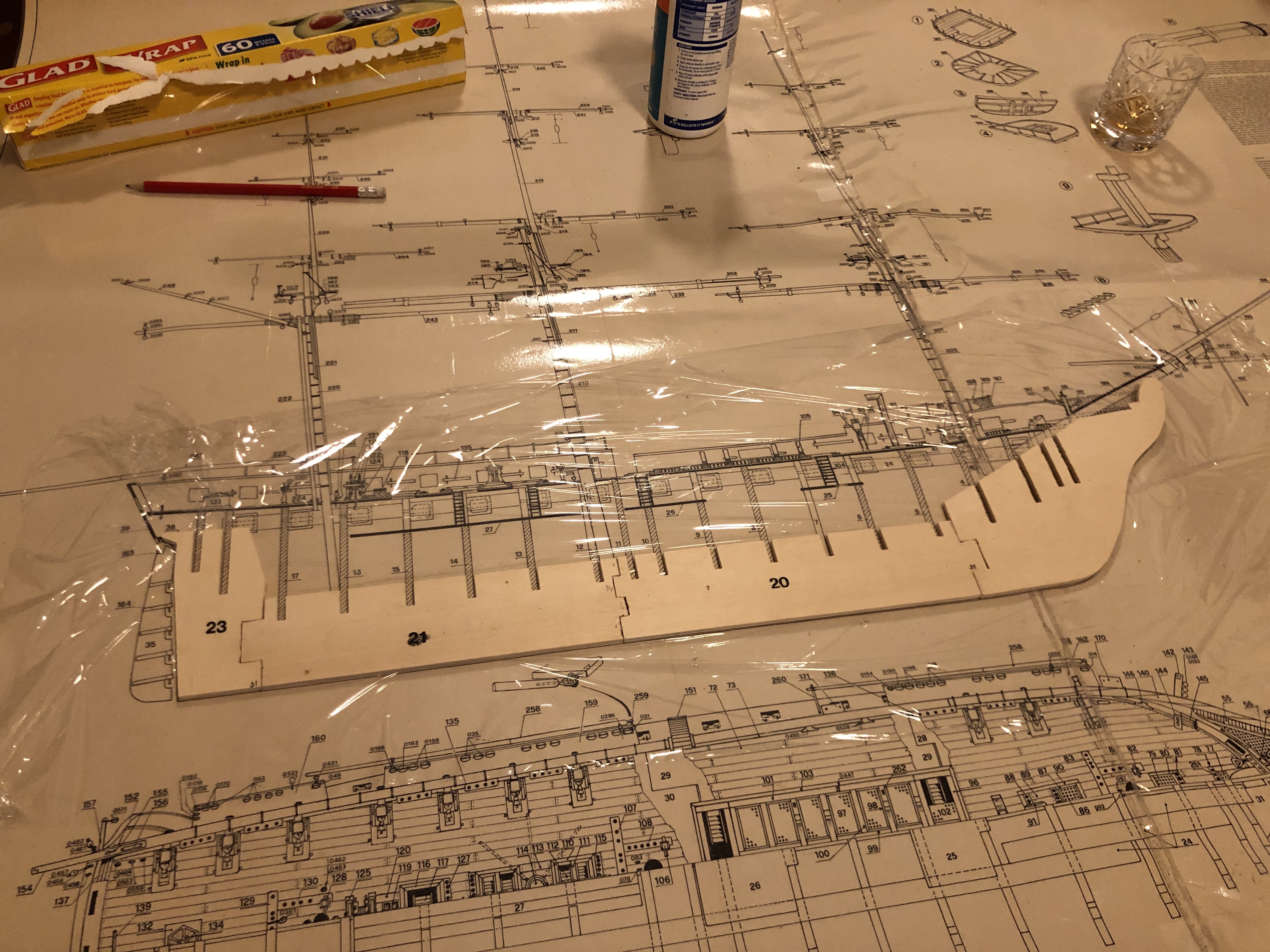 Construction starts with the hull, specifically the keel. The model keel comes in 3 pieces of 4mm plywood which are glued together. The instructions specify that the slots for the bulkheads should be positioned on top of the plans. Since the provided cut pieces are not absolutely accurate, some trimming with a sharp knife was required. I used to own some scalpels, and boxes of spare blades, but unable to locate them so I purchased an “Exacto” knife and a packet of spare No 11 (pointy, straight blade) blades. To avoid getting glue on the laminated plan I covered the plan with GladWrap.