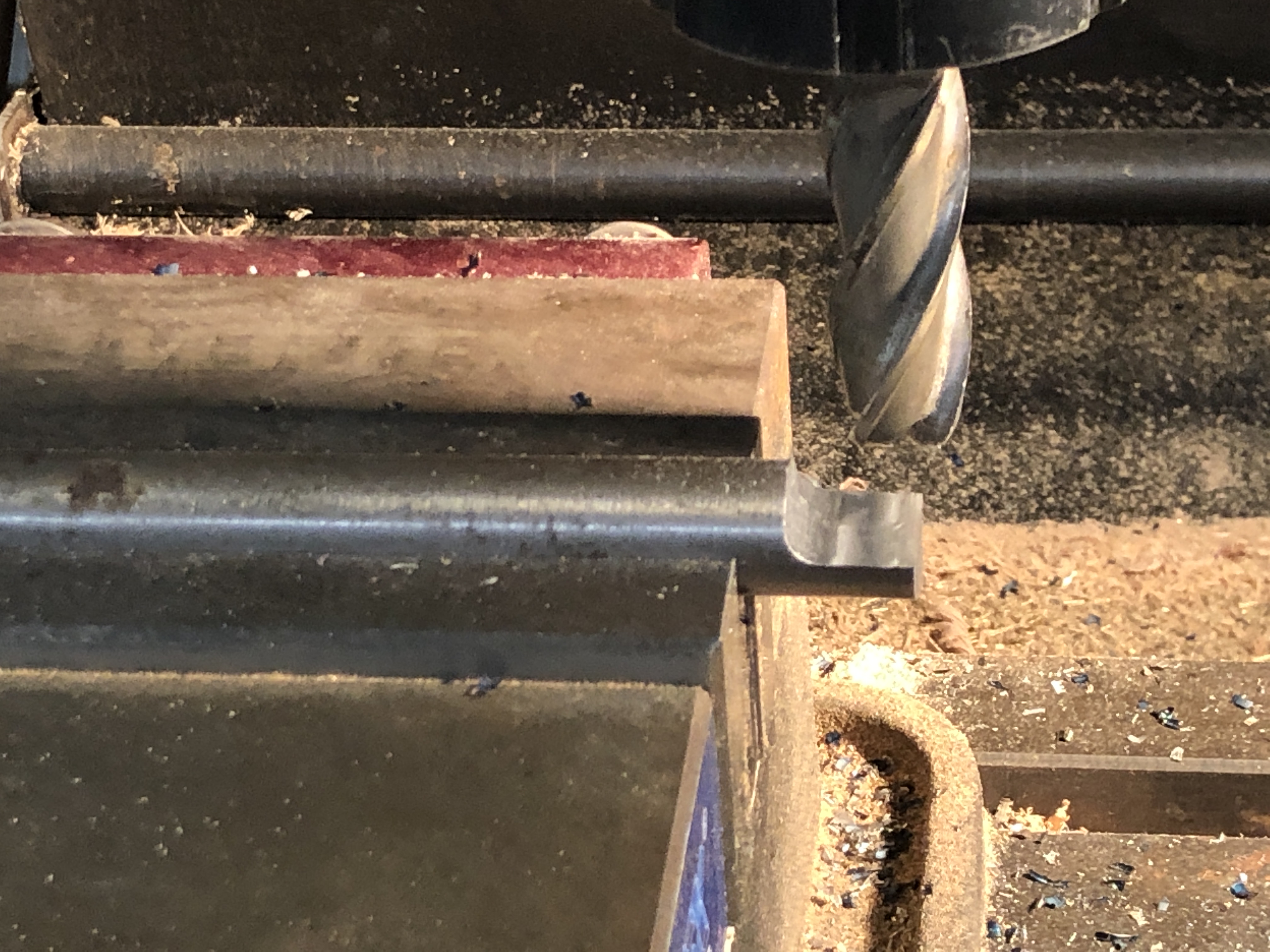 3. 2 holes needed to have pockets cut with an end mill first. Yes, I know. Should not have used a 3 jaw drill chuck to hold the end mill, but it worked on this steeply sloped part.