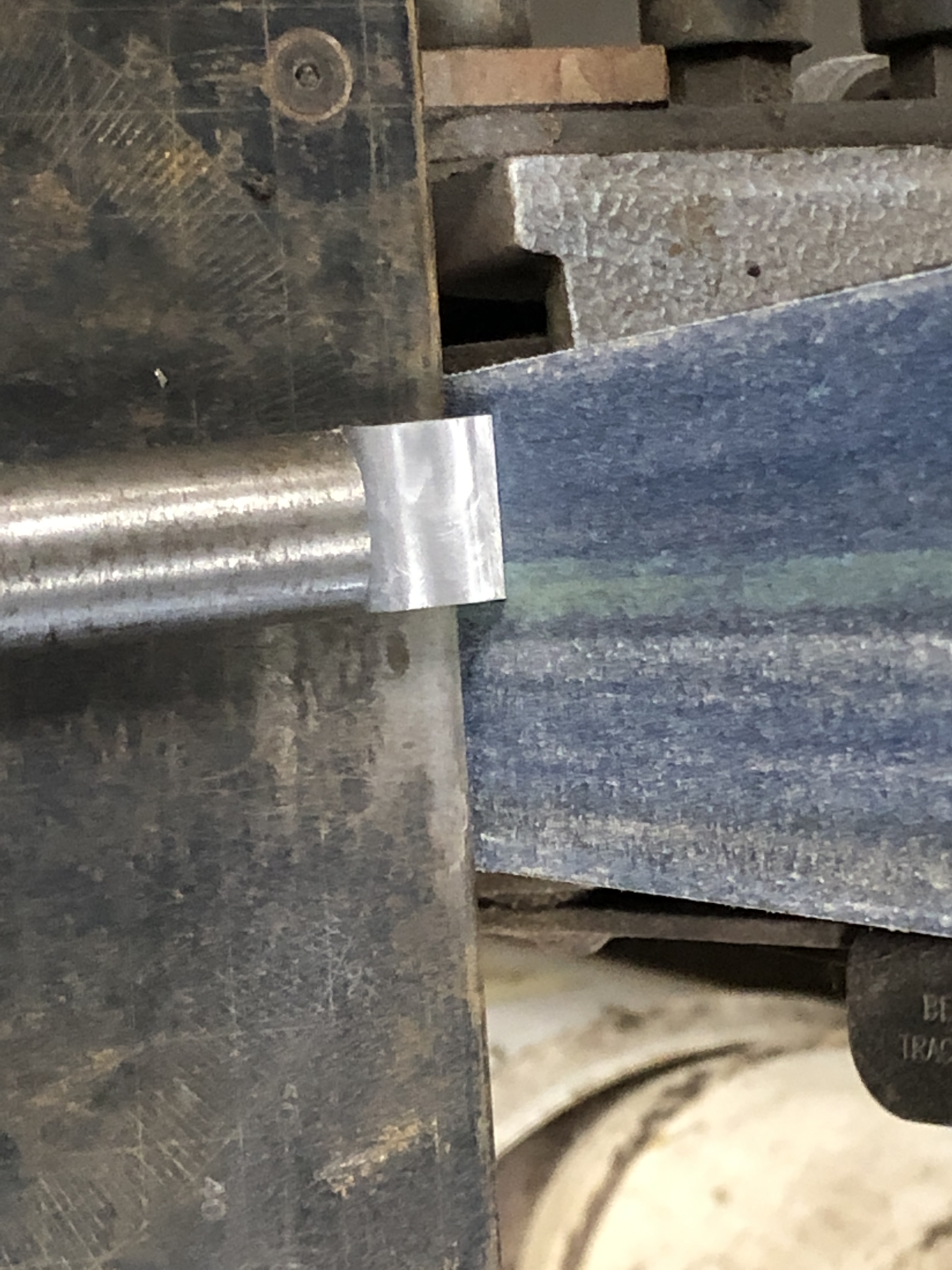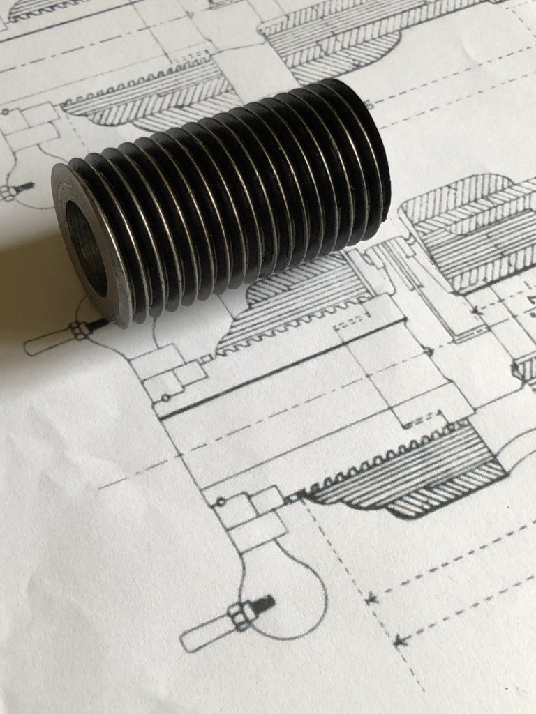 The silver steel / drill rod is 17.94mm diameter. The flat is milled, removing 8.94mm and leaving ~9.0mm. The cutting end was hardened by heating to cherry red , then quenching in oil. It was still able to be filed, so not hard enough, so I repeated the heat-quench cycle, using a water quench, and that worked well.Using the belt sander to give some side and rear relief. Later I added a chamfer to the cutting corner (see next photo).Cutting corner on the left.The “business end” as requested by John Marshall. This is after cutting through 305mm of 1020 steel, and it needs another touch up with the diamond lap. initially I used the D bit as shown on the belt sander above, but the cut improved after the bevel was added with relief to the cutting corner. The only purpose for the recess is to accumulate swarf during the cutting process. But the recess fills quickly and it needed cleaning out every 5-10mm of drilling depth. The D bit was held in a 40ER collet in the tailstock. Plenty of cutting fluid was used. The chips were cleared every 5mm of cut. The D bit was sharpened 3-4 times during the process using a diamond lap. Enlarging the bore to 17.95mm with the D bit took 15min.This was taken after using the D bit. The surface finish was improved further after passing the reamer. I am not concerned by the rough appearance at this end because it will be machined out to 28mm for a depth of 50mm to accomodate the breech screw and breech plug.The breech screw is shown in drawings of the era as a buttress thread, with a pitch of approximately 1.25″. I have some 1.25″ diameter threaded rod, category H2, with a pitch of 1/8″ which at scale 1:10, is very close to the original, although not buttress profile. The drawing is very close to full size for the model. I drilled, D drilled and reamed the through hole, and am considering how I will cut the thread into the breech of the barrel. Still pondering whether to try to cut a buttress thread…