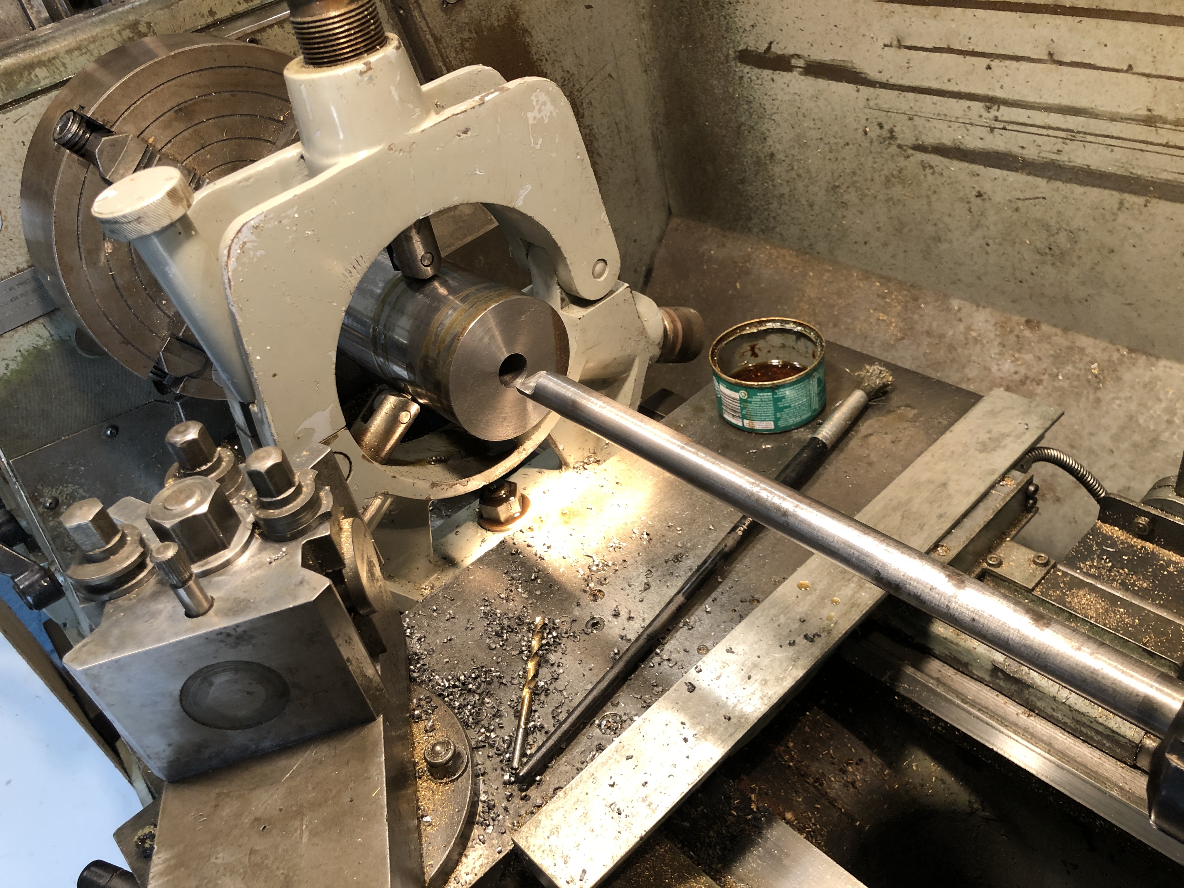 The first step was to buy and cut to length the 1020 steel shaft. Then the piece was mounted in the 4 jaw chuck, and dialled within 0.05mm at the chuck. The tailstock end was supported in the fixed steady, and also dialled in. I was not trying for perfection because it is a case of time and diminishing returns, and straightness of the bore and concentricity between the bore and the exterior of the barrel are the main concerns.