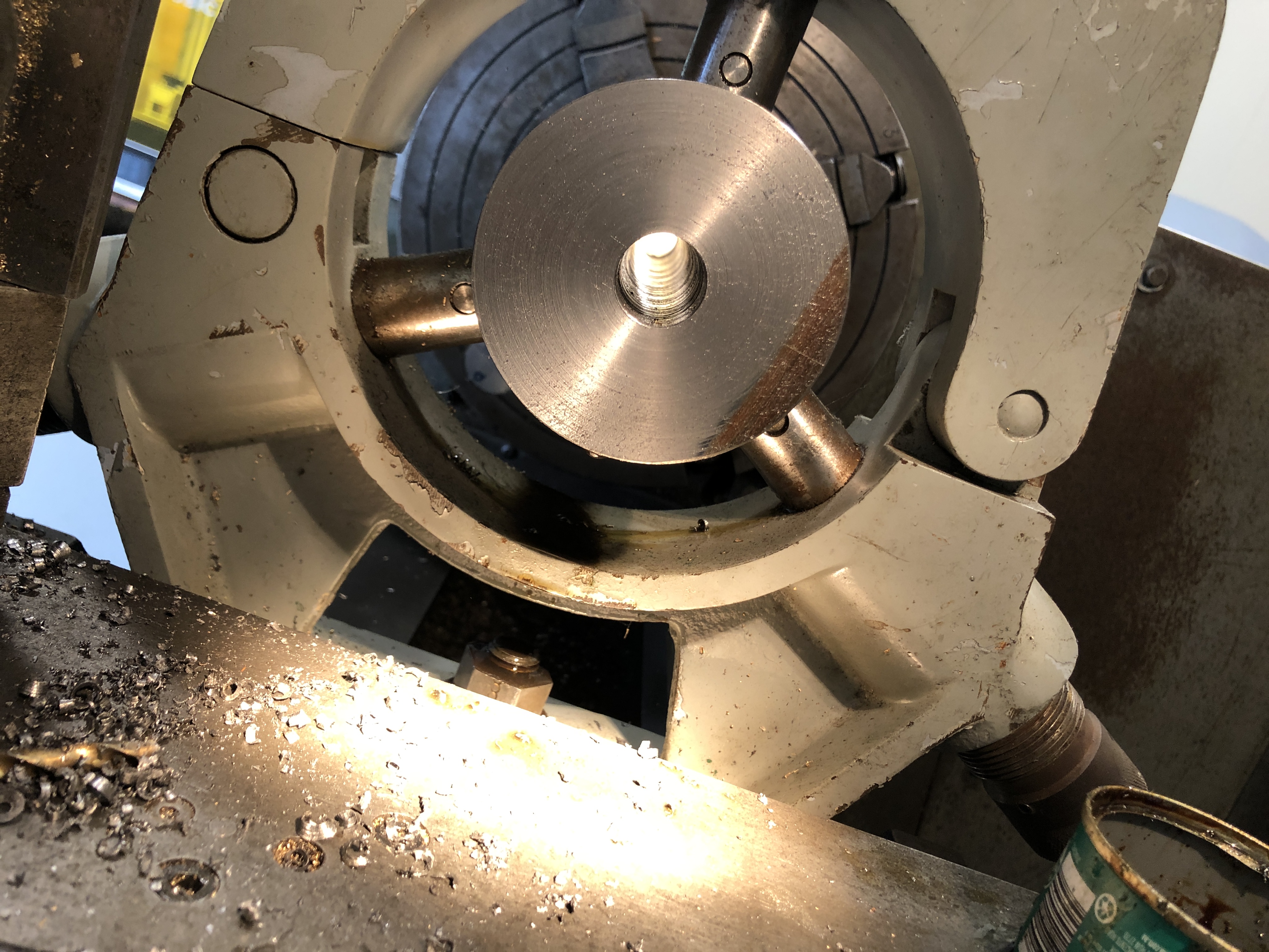 The breech piece will next act as a tailstock centre for turning the exterior of the barrel between centres, after removal of the fixed steady.