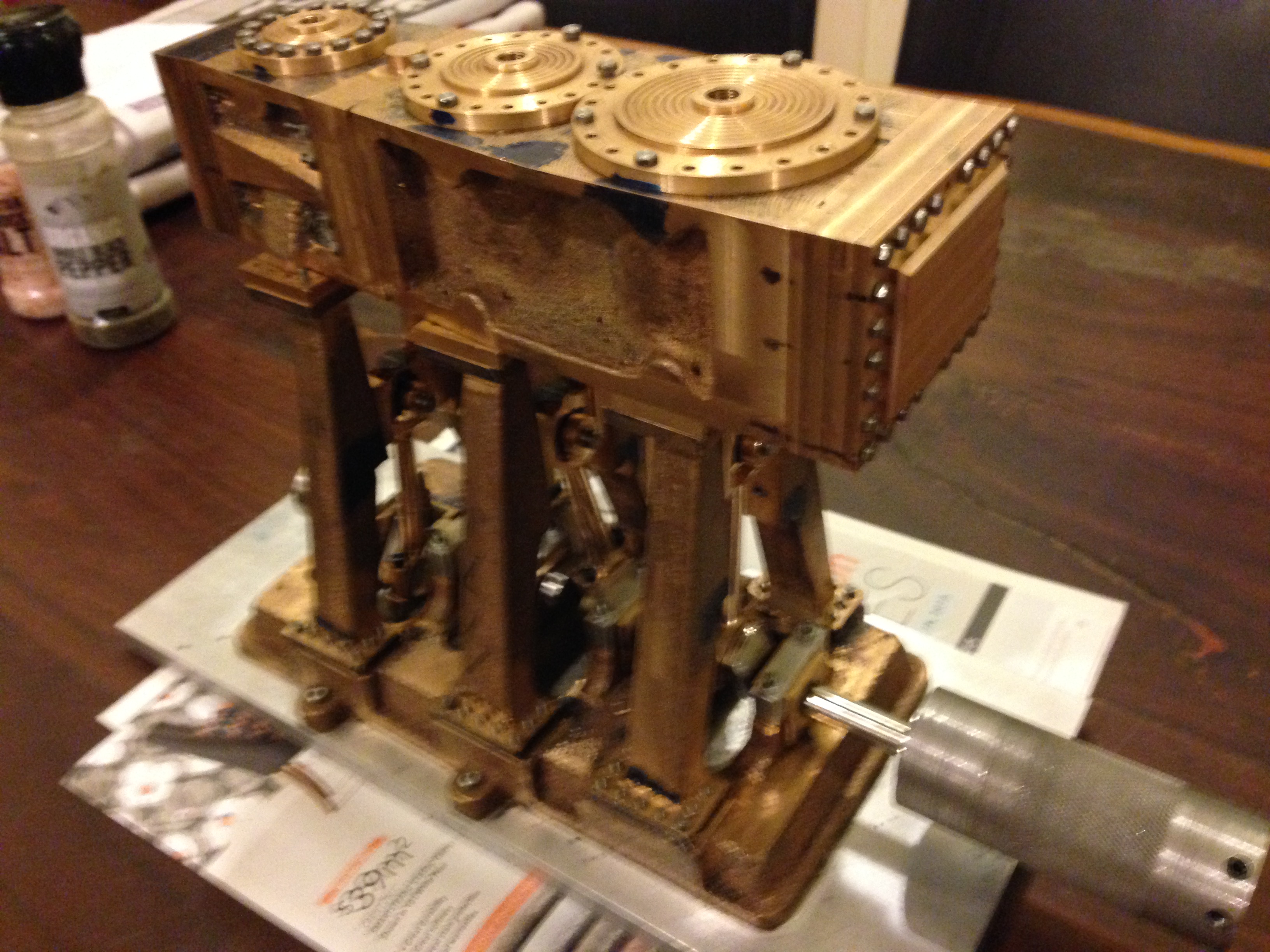 I made a Bolton 9 triple expansion steam engine 2014 – 2017. It took 3 years from opening the parcel of gunmetal and cast iron castings, to running it on compressed air and later on steam. It still runs on steam once or twice each year at our model engineering club’s exhibitions.
